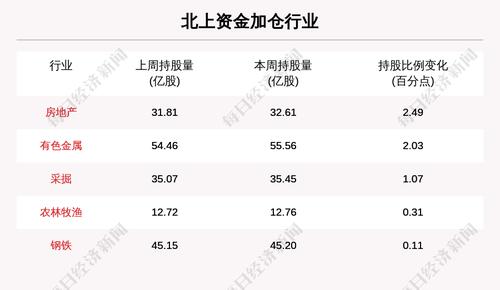 本周北上资金加仓的行业共有7个。其中,房地产行业加仓最明显,北上资金持股数环比增加2.49%。其他北上资金加仓较多的行业还包括有色金属、采掘、农林牧渔。