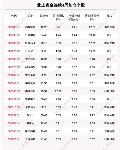 北上资金连续4周买入63个股,其中电子行业的个股最多,有10只。从市场表现来看,北上资金连续4周的加仓个股中,本周15只个股股价上涨,其中赤峰黄金(600988.SH,收盘价:19.25元)涨幅最大,上涨22.61%,其他涨幅较大的个股包括亚钾国际(000893.SZ,收盘价:34.45元)、以岭药业(002603.SZ,收盘价:28.18元)、江南化工(002226.SZ,收盘价:6.58元)。