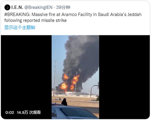 社交媒体上关于沙特西部城市吉达一处石油设施起火的视频 (图片来源:工业专业杂志IEN推特截图)