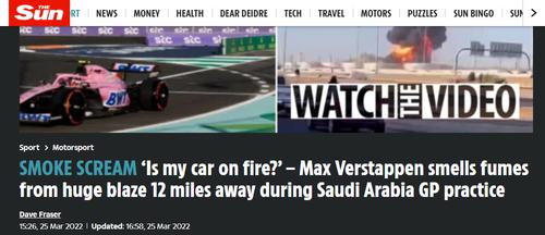值得注意的是,在这处储油设施边上不远就是沙特吉达滨海赛道,事发时正在举行F1沙特站的练习赛,全世界观众都远远望见赛场外升腾起的浓烟。据英国媒体报道,红牛车队的车手维斯塔潘在广播通讯中询问车队“我能闻到什么东西烧起来了……是我的车么?”