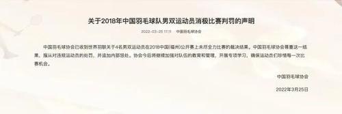 中国羽毛球协会25日在官网表示,已收到世界羽联关于4名运动员在2018中国(福州)公开赛上未尽全力比赛的裁决结果。中国羽毛球协会尊重这一结果,服从对违规运动员的处罚,并将追加内部惩处。协会今后将继续加强对队伍的教育和管理,开展专项学习,确保运动员们珍惜每一次比赛机会。