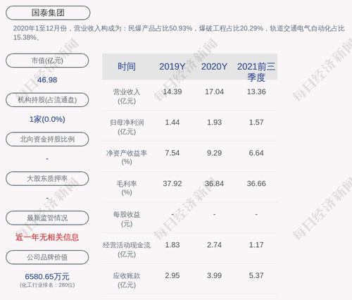 2020年1至12月份,国泰集团的营业收入构成为:民爆产品占比50.93%,爆破工程占比20.29%,轨道交通电气自动化占比15.38%。