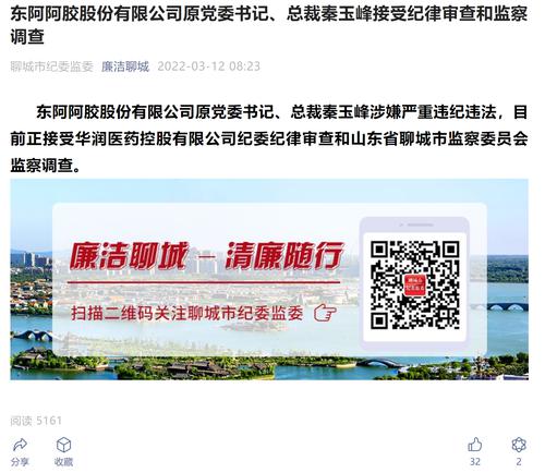 在这之前,东阿阿胶原党委书记、总裁秦玉峰涉嫌严重违纪违法被带走调查的消息传出。因为尚处留置阶段,其所涉具体问题并未公开。