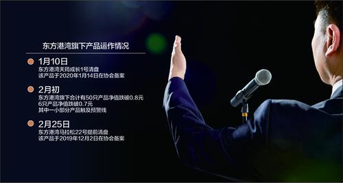 今年2月初,《每日经济新闻》独家报道了东方港湾旗下合计有50只产品净值跌破0.8元,还有6只产品净值跌破0.7元,其中一小部分产品触及预警线。近期,但斌旗下更是出现了提前清盘的私募产品,例如今年2月25日提前清盘的东方港湾马拉松22号,该产品于2019年12月2日在协会备案;1月10日清盘的东方港湾天筠成长1号,该产品于2020年1月14日在协会备案。