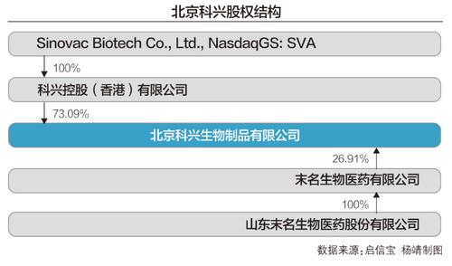 从股权结构上看,科兴生物持有科兴控股(香港)有限公司(以下简称科兴控股)100%股权,科兴控股则持有北京科兴73.09%股权,后者剩余的26.91%股权则属于厦门未名。