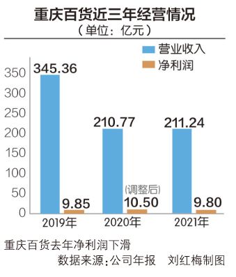2021年,重庆百货实现营业收入211.24亿元,同比增长0.22%;实现归母净利润9.80亿元,同比下降6.68%;实现扣非后归母净利润9.23亿元,同比增长58.65%。