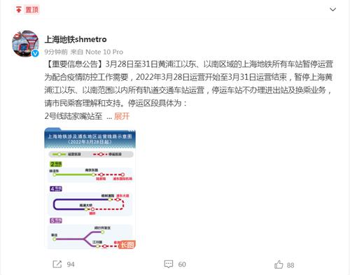 3月27日,据@上海地铁shmetro消息,3月28日至31日黄浦江以东、以南区域的上海地铁所有车站暂停运营。