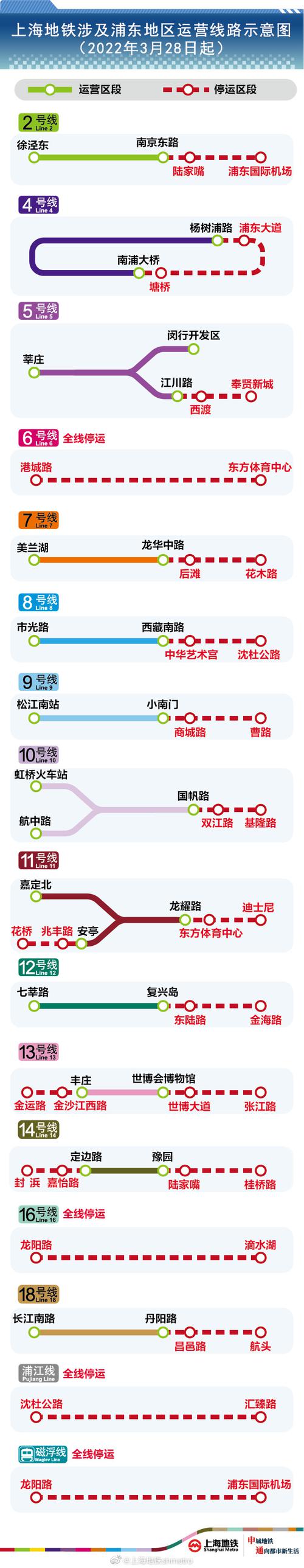 为配合疫情防控工作需要,2022年3月28日运营开始至3月31日运营结束,暂停上海黄浦江以东、以南范围以内所有轨道交通车站运营,停运车站不办理进出站及换乘业务,请市民乘客理解和支持。停运区段具体为: