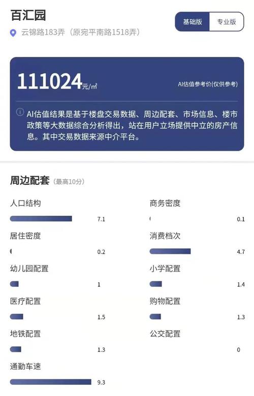 每经品房小程序显示,百汇园在周边配套指标中,得分指标较高的是通勤车速和人口结构,分别为9.3分和7.1分(满分为10分)。