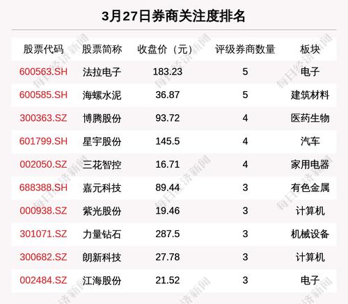 从券商对个股的关注程度来看,有21只个股获得多家券商关注,券商关注数量排名居前的个股是法拉电子(600563.SH)、海螺水泥(600585.SH)、博腾股份(300363.SZ)。