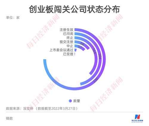 截至3月27日,创业板审核信息披露,处于注册生效(注册结果)的有330家,紧随其后的是“终止”164家,“已问询”的有204家,中止的有57家,上市委会议通过的有14家,提交注册的有66家,已受理的5家。