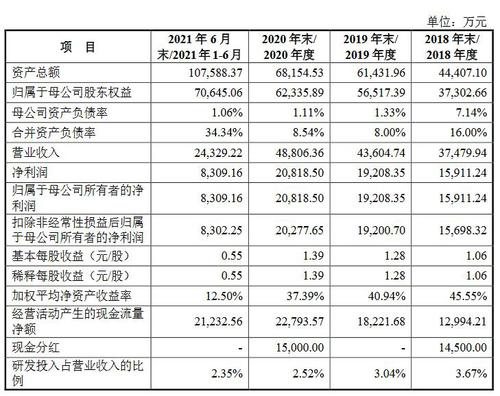 业绩方面,公司2018、2019、2020年度分别录得营收3.75亿元、4.36亿元、4.88亿元;净利润1.59亿元、1.92亿元,2.08亿元。2021年上半年,公司营收2.43亿元,净利润0.83亿元。