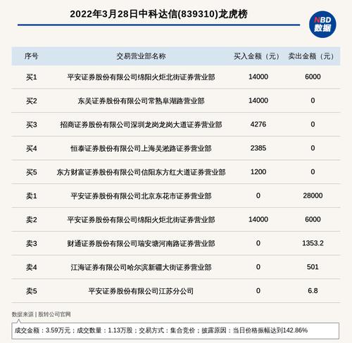 每经讯,2022年3月28日,新三板创新层公司中科达信(839310)登上龙虎榜,交易方式是集合竞价,披露原因是当日价格振幅达到142.86%,成交数量1.13万股,成交金额3.59万元。买一席位为平安证券股份有限公司绵阳火炬北街证券营业部,买入1.4万元;卖一席位为平安证券股份有限公司北京东花市证券营业部,卖出2.8万元。
