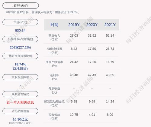 每经AI快讯,泰格医药(SZ 300347,收盘价:98.6元)3月28日晚间发布年度业绩报告称,2021年营业收入约52.14亿元,同比增加63.32%;归属于上市公司股东的净利润盈利约28.74亿元,同比增加64.26%;基本每股收益盈利3.31元,同比增加50.45%。拟每10股派发现金红利5元(含税)、不送红股、不转增。