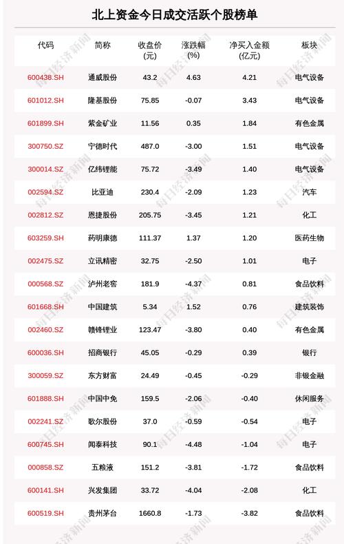 3月28日,北上资金成交活跃个股榜单中,净买入个股共13只,金额最多的是通威股份(600438.SH,收盘价:43.2元),净买入4.207亿元;净卖出个股共7只,金额最多的是贵州茅台(600519.SH,收盘价:1660.8元),净卖出3.824亿元。