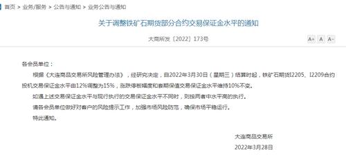 每经AI快讯,根据《大连商品交易所风险管理办法》,经研究决定,自2022年3月30日(星期三)结算时起,铁矿石期货I2205、I2209合约投机交易保证金水平由12%调整为15%,涨跌停板幅度和套期保值交易保证金水平维持10%不变。(大商所网站)