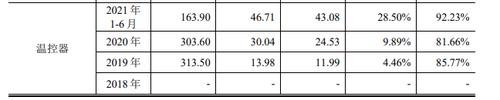“保险丝”有一个学名,就是热熔断体。雅宝电子的下游客户主要涉及家用电器市场。需要注意的是,公司主要业务为热熔断体销售,该项在2018年~2021年上半年(简称为“报告期内”)占公司营业收入比例超过99%,而温控器业务处于起步阶段,市场有待大力拓展。该业务也是公司募投项目的重点之一。