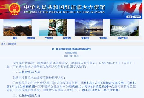 为加强疫情防控,确保赴华旅客健康安全,根据国内有关规定,自2022年4月4日(含当日)起,所有乘坐加拿大赴华直飞航班人员的行前检测要求如下: