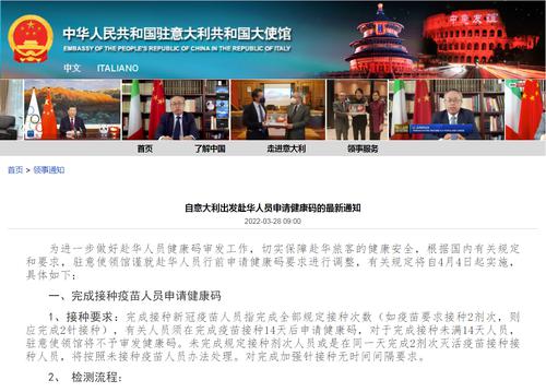 为进一步做好赴华人员健康码审发工作,切实保障赴华旅客的健康安全,根据国内有关规定和要求,驻意使领馆谨就赴华人员行前申请健康码要求进行调整,有关规定将自4月4日起实施,具体如下: