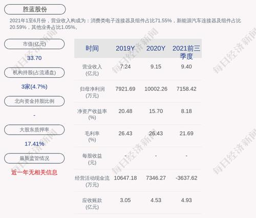 2021年1至6月份,胜蓝股份的营业收入构成为:消费类电子连接器及组件占比71.55%,新能源汽车连接器及组件占比20.59%,其他业务占比1.05%。