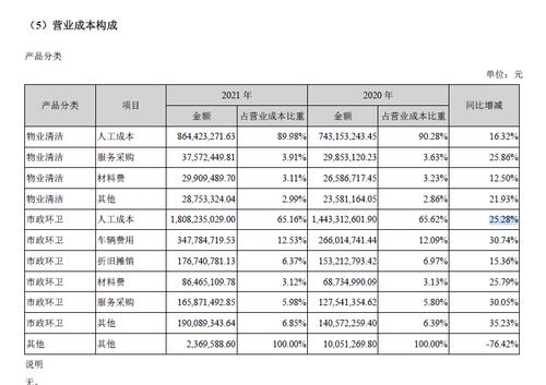 据2021年年报,玉禾田市政环卫业务的人工成本达18.08亿元,占营业成本比重为65.16%,同比增长25.28%;物业清洁业务的人工成本达8.64亿元,占营业成本比重为89.98%,同比增长16.32%。