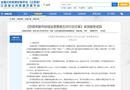 近日,江苏省公共资源交易平台发布《苏锡常都市快线运营筹备五年行动方案》咨询服务项目招标公告。