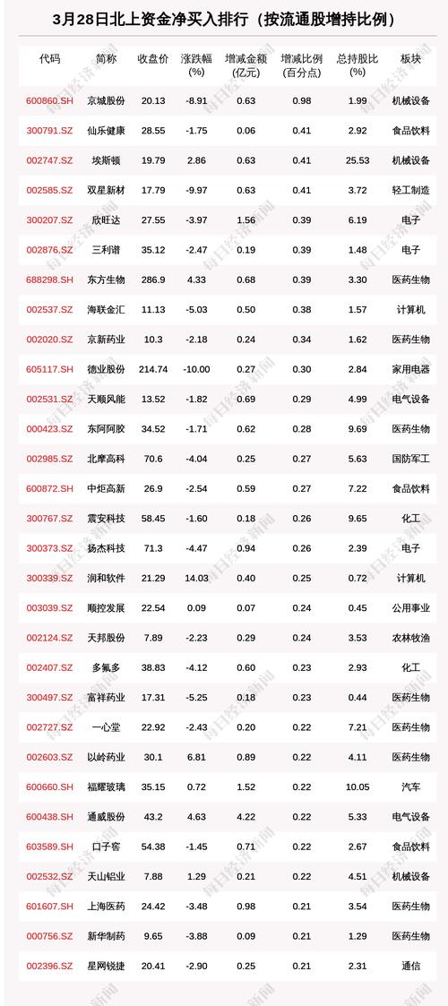 每经AI快讯,3月28日,北上资金净买入的个股共有787只,北上资金加仓比例超1%的有627只。其中,京城股份(600860.SH,收盘价:20.13元)加仓比例最为明显,最新持股比例1.99%,环比增加0.98个百分点。其他北上资金加仓比例较多的个股还包括仙乐健康(300791.SZ,收盘价:28.55元)、埃斯顿(002747.SZ,收盘价:19.79元)、双星新材(002585.SZ,收盘价:17.79元)。