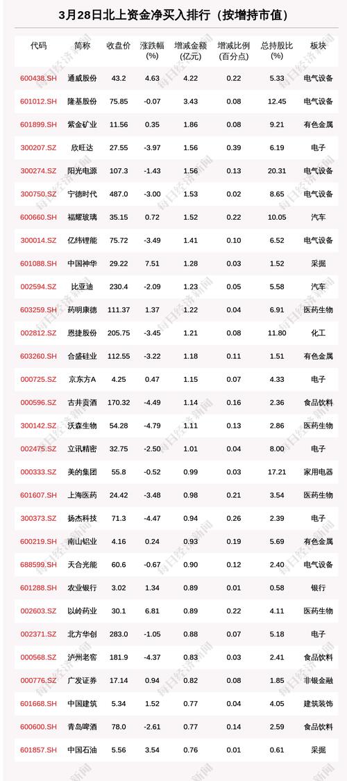 3月28日,按照北向资金增持市值排序,通威股份(600438.SH,收盘价:43.2元)增持市值最大,增持市值4.220亿元,环比增加4.44%。其他北上资金增持市值较多的个股还包括隆基股份(601012.SH,收盘价:75.85元)、紫金矿业(601899.SH,收盘价:11.56元)、欣旺达(300207.SZ,收盘价:27.55元)。