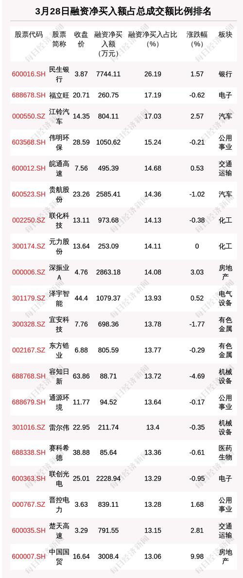 3月28日两市共有1059只个股有融资资金净买入。共有44只股票融资净买入额占总成交金额比例超10%,其中民生银行、福立旺、江铃汽车排名前三,占比分别为26.19%、17.19%、17.03%。