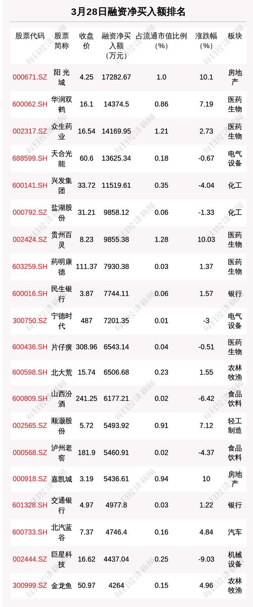 从融资资金净买入金额来看,共有5只个股净买入金额超亿元,其中阳 光 城、华润双鹤、众生药业排名前三,买入金额分别为1.73亿元、1.44亿元、1.42亿元。