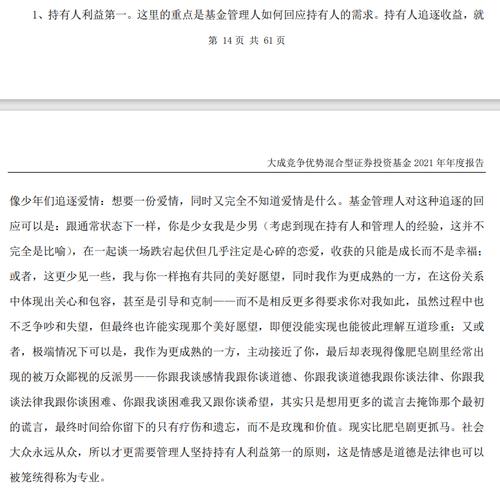 比如大成基金首席权益投资官、大成竞争优势的基金经理徐彦,在年报中表示,“持有人追逐收益,就像少年们追逐爱情:想要一份爱情,同时又完全不知道爱情是什么。基金管理人对这种追逐的回应可以是:跟通常状态下一样,你是少女我是少男(考虑到现在持有人和管理人的经验,这并不完全是比喻),在一起谈一场跌宕起伏但几乎注定是心碎的恋爱,收获的只能是成长而不是幸福;或者,这更少见一些,我与你一样抱有共同的美好愿望,同时我作为更成熟的一方,在这份关系中体现出关心和包容,甚至是引导和克制——而不是相反更多得要求你对我如此,虽然过程中也不乏争吵和失望,但最终也许能实现那个美好愿望,即便没能实现也能彼此理解互道珍重;又或者,极端情况下可以是,我作为更成熟的一方,主动接近了你,最后却表现得像肥皂剧里经常出现的被万众鄙视的反派男——你跟我谈感情我跟你谈道德、你跟我谈道德我跟你谈法律、你跟我谈法律我跟你谈困难、你跟我谈困难我又跟你谈希望,其实只是想用更多的谎言去掩饰那个最初的谎言,最终时间给你留下的只有疗伤和遗忘,而不是玫瑰和价值。”
