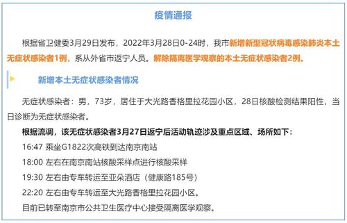 据江苏省卫健委3月29日发布,3月28日南京市新增新型冠状病毒感染肺炎本土无症状感染者1例,系从外省市返宁人员。