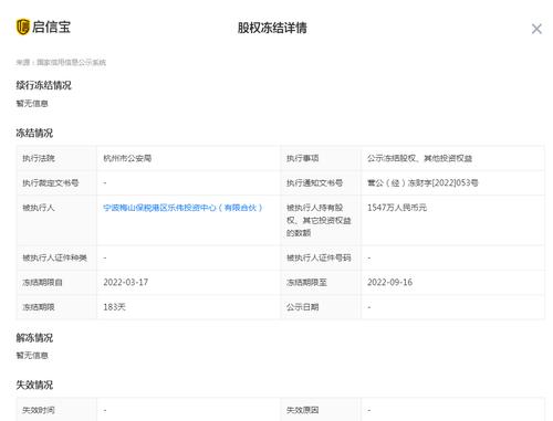 据启信宝显示,3月26日,杭州量子泛娱影视文化传媒股份有限公司新增股权冻结信息,被冻结股权数额1547万人民币,被执行人为宁波梅山保税港区乐伟投资中心(有限合伙),冻结期限至2022年9月16日。