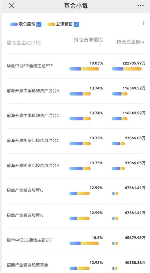 另外,Z哥使用“每经牛眼”的“基金小每”服务,查询了一下同时持有歌尔股份和立讯精密的基金,其中持股市值较大的,主要是华夏中证5G通信主题ETF(合计持仓22.27亿元),前海开源中国稀缺资产混合(合计持仓11.65亿元),以及前海开源国家比较优势混合(合计持仓9.7亿元)。