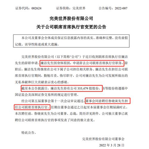 28日晚间,完美世界发布公告称,近日收到联席首席执行官廉洁的辞职申请。公司表示,廉洁因身体原因,申请辞去公司联席首席执行官职务,辞职后,廉洁将继续在公司下属子公司担任相关职务。截至公告披露日,廉洁持有公司35.55万股股份。