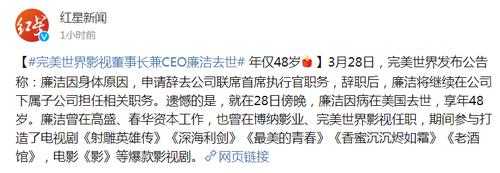 3月29日,据中新经纬、红星新闻,完美世界股份有限公司(下称完美世界)前联席首席执行官廉洁已去世。完美世界内部人士亦确认了上述消息。