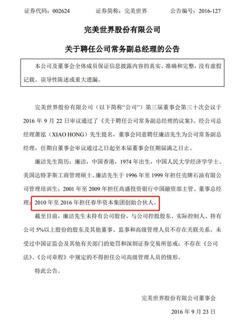 2016年9月23日,完美世界发布人事任命公告,任命廉洁为上市公司总裁及控股集团董事,在其任命公告书上,对廉洁的描述为“廉洁先生于9月23日入职完美世界,之前是春华资本创始合伙人”。