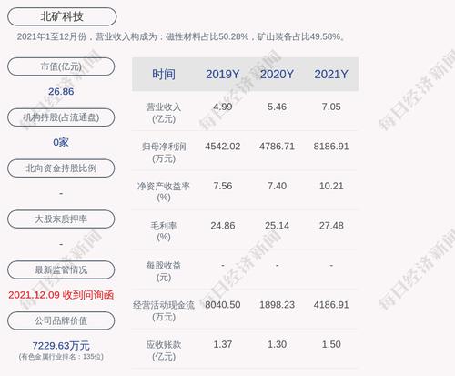 2021年1至12月份,北矿科技的营业收入构成为:磁性材料占比50.28%,矿山装备占比49.58%。