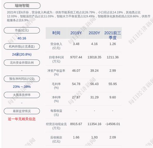 2021年1至6月份,瑞纳智能的营业收入构成为:供热节能系统工程占比26.79%,小口径占比14.19%,其他类占比12.03%,智能温控产品占比11.03%,智能水力平衡装置占比9.49%,智能模块化换热机组占比8.66%,供热节能服务占比6.9%。