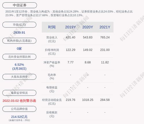每经AI快讯,中信证券(SH 600030,收盘价:20.25元)3月29日发布年度业绩报告称,2021年营业收入约765.24亿元,同比增加40.71%;归属于上市公司股东的净利润盈利约231亿元,同比增加55.01%;基本每股收益盈利1.77元,同比增加52.59%。拟每10股派发现金红利人民币5.4元(含税)、不送红股、不转增。