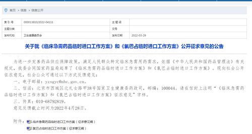 1丨国家卫健委就《临床急需药品临时进口工作方案》公开征求意见