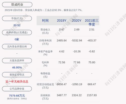 2021年1至6月份,双成药业的营业收入构成为:工业占比92.3%,服务业占比7.7%。