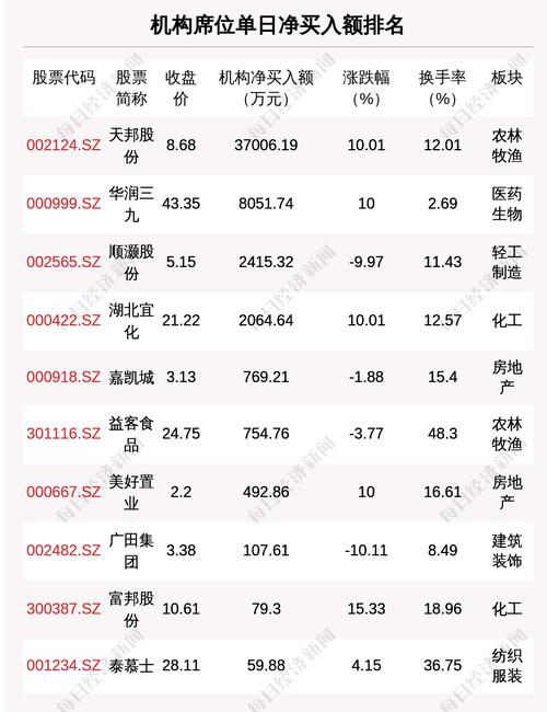 在龙虎榜中,涉及机构专用席位的个股有21只,净买入额前三的是天邦股份、华润三九、顺灏股份,分别为3.7亿元、8051.74万元、2415.32万元。