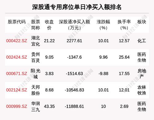 在龙虎榜中,涉及深股通专用席位的个股有5只,湖北宜化的深股通专用席位净买入额最大,净买入2277.61万元。