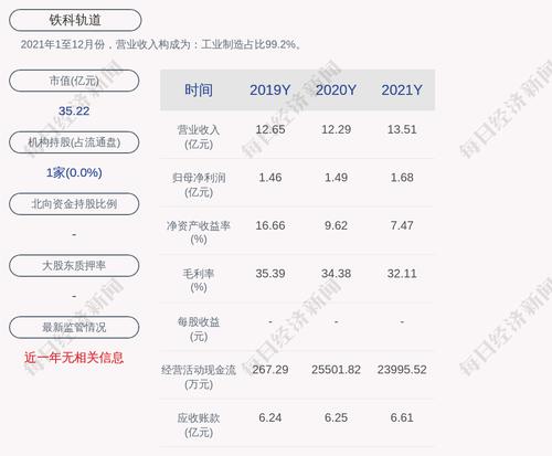 每经AI快讯,铁科轨道(SH 688569,收盘价:16.72元)3月29日晚间发布年度业绩报告称,2021年营业收入约13.51亿元,同比增加9.86%;归属于上市公司股东的净利润盈利约1.68亿元,同比增加12.53%;基本每股收益盈利0.8元,同比减少5.88%。拟每10股派发现金红利2.5元(含税)、不送红股、不转增。