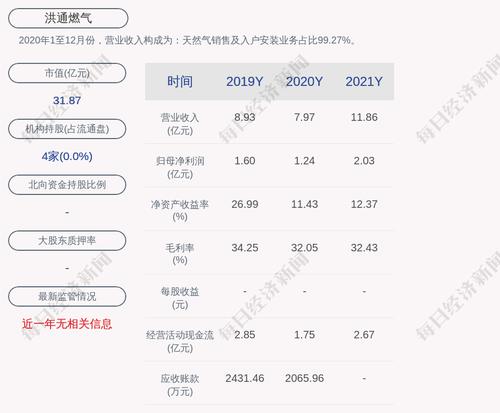 每经AI快讯,洪通燃气(SH 605169,收盘价:15.32元)3月29日晚间发布年度业绩报告称,2021年营业收入约12.04亿元,同比增加51.06%;归属于上市公司股东的净利润盈利约2亿元,同比增加61.73%;基本每股收益盈利0.9619元,同比增加28.03%。拟每10股派发现金红利5元(含税)、向全体股东每10股以资本公积金转增3.6股、不送红股。