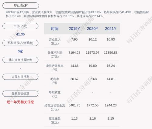2021年1至12月份,鹿山新材的营业收入构成为:功能性聚烯烃热熔胶粒占比43.81%,热熔胶膜占比41.43%,功能性新材料占比8.4%,医用材料和生物降解材料等占比3.92%,其他业务占比2.44%。