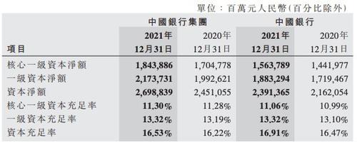 资本充足率方面,中国银行集团核心一级资本充足率为11.30%,2020年末为11.28%,提升0.02个百分点;一级资本充足率为13.32%,2020年末为13.19%,提升0.13个百分点;资本充足率为16.53%,2020年末为16.22%,提升0.31个百分点。