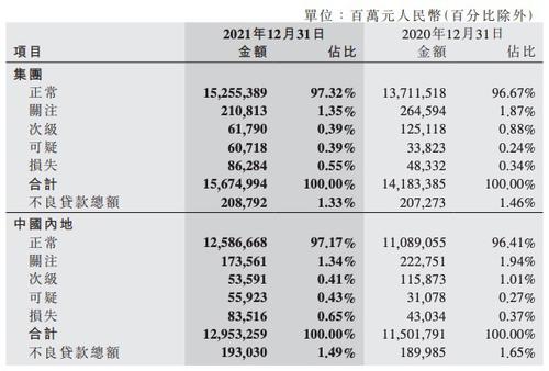 资产质量方面,2021年末,中国银行集团不良贷款总额2,087.92亿元,比上年末增加15.19亿元,不良贷款率1.33%,比上年末下降0.13个百分点。集团贷款减值准备余额3,905.41亿元,比上年末增加219.22亿元。不良贷款拨备覆盖率187.05%,比上年末上升9.21个百分点。