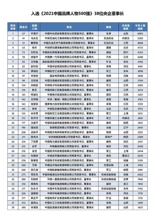 38位央企掌舵者在榜单中排名前10的是:宁高宁、马永生、戴厚良、杨杰、刘烈宏、徐留平、王祥喜、舒印彪、谭瑞松、辛保安。他们分别来自以下央企:中国中化控股有限责任公司、中国石油化工集团有限公司、中国石油天然气集团有限公司、中国移动通信集团有限公司、中国联合网络通信集团有限公司、中国第一汽车集团有限公司、国家能源投资集团有限责任公司、中国华能集团有限公司、中国航空工业集团有限公司、国家电网有限公司。这38位品牌人物掌舵的航母级央企,都曾入榜《2021中国品牌500强》。